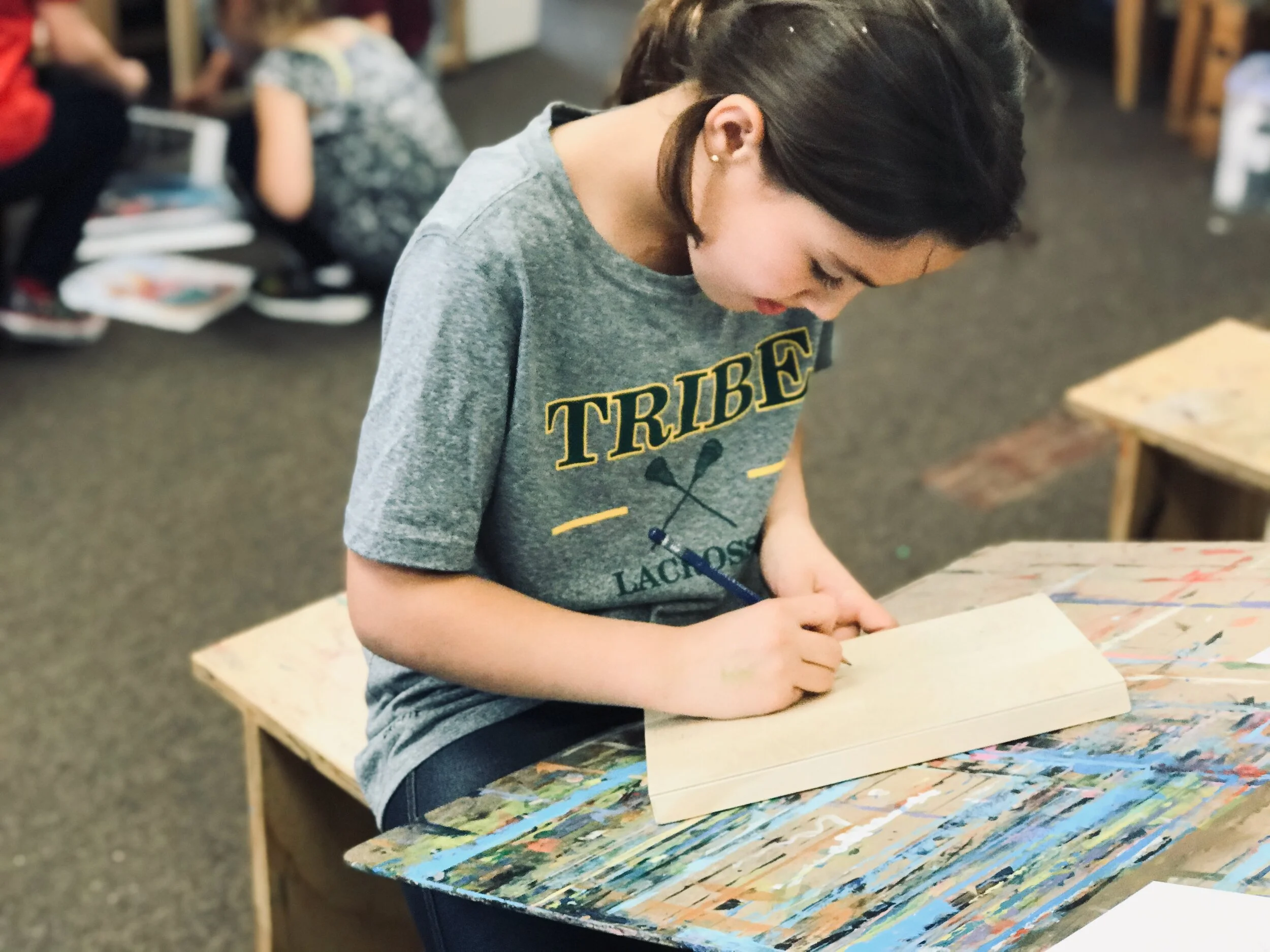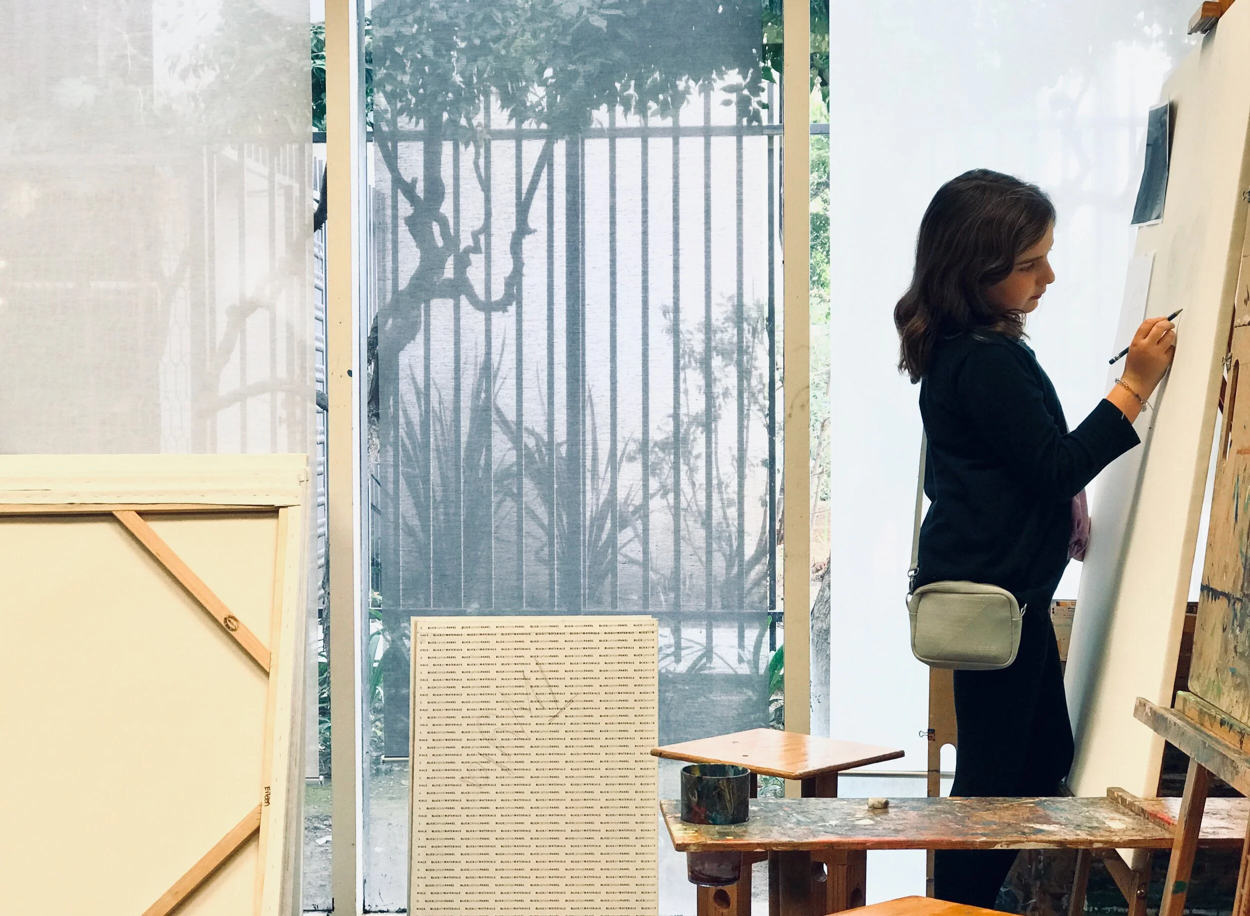 Starting her drawing on her large canvas!