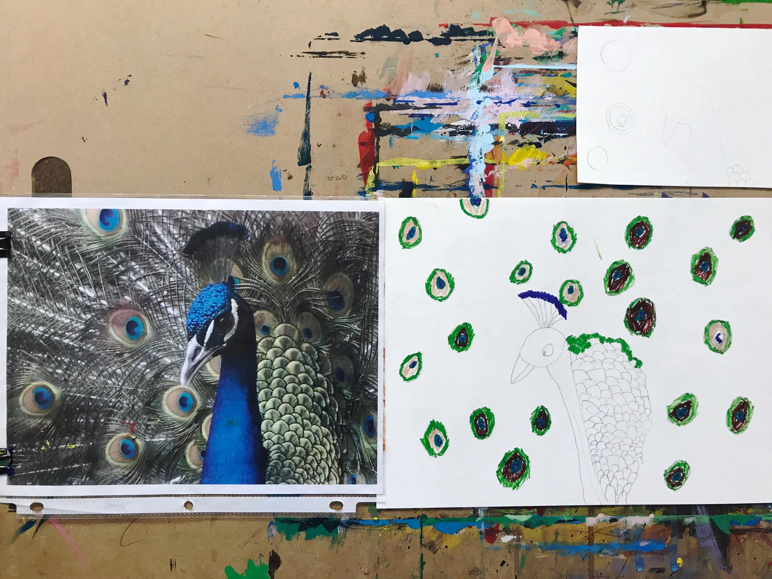 Margaret Tonapetyan August 5, 2017 Work in progress. Margaret Tonapetyan August 5, 2017 A beautiful peacock in the process of being drawn by one of our students.